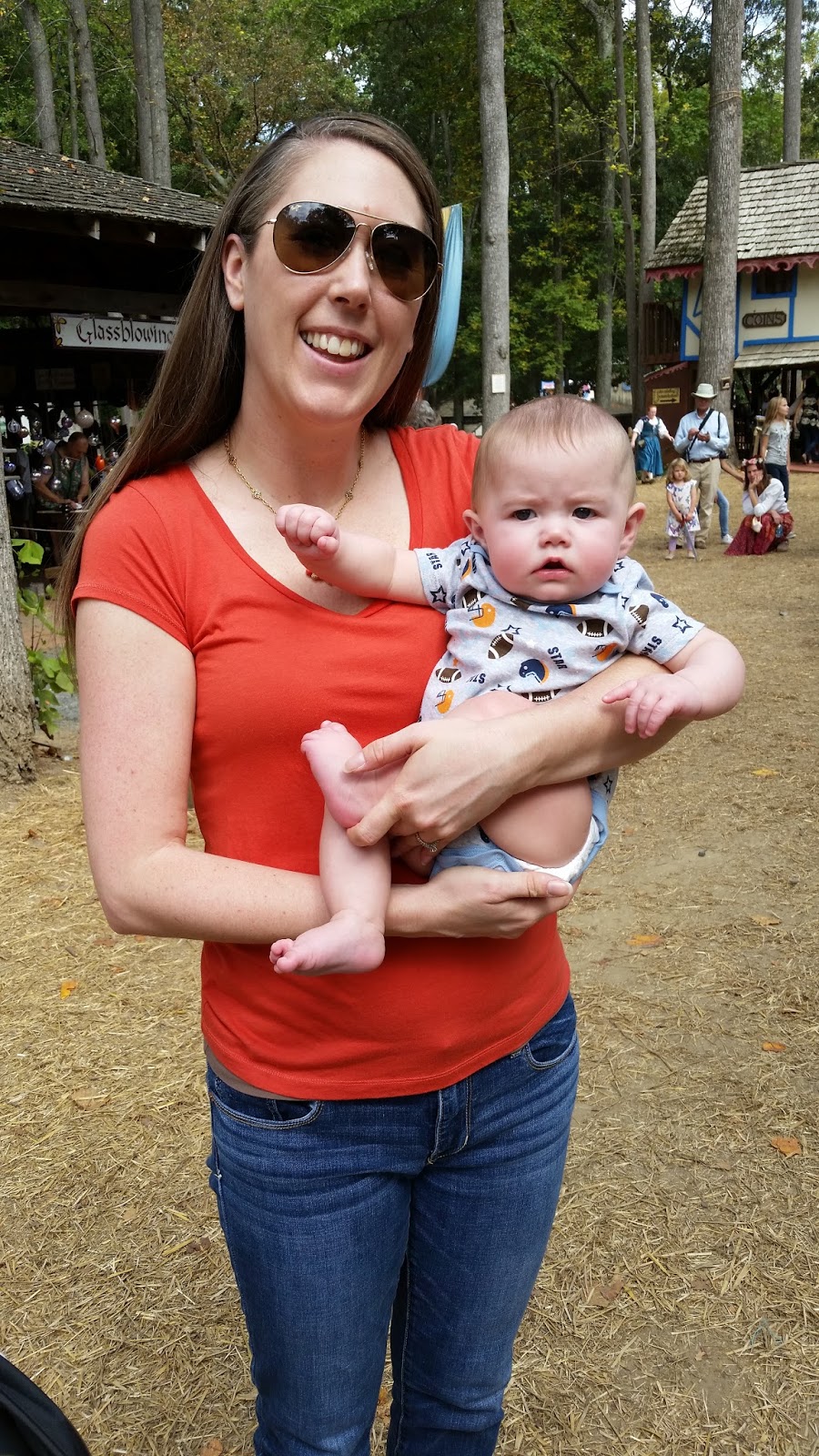 Today was a beautiful, kinda cool day so we headed out to the annual Renaissance Festival. Doug and I were very nervous to go. There a lot of people, lots of people drinking, and not a lot of room to walk let alone maneuver a stroller. We contemplated the Bjorn carrier but it was still a bit warm and we would have been really hot. The stroller worked but the rocky/straw roads/paths made things interesting. I definitely got my workout pushing him up and down the hills. He loved looking around and being outside. He didn't fuss one time which let us stay longer. We shopped, got our eat on, people watched (because that is the main reason you go), and we were pooped. We were able to see parts of a few acts but since they were so crowded it was hard to get a good seat that was stroller friendly. We had a great time spending the afternoon together outside on the beautiful day. I definitely know three people who are going to sleep amazing tonight!